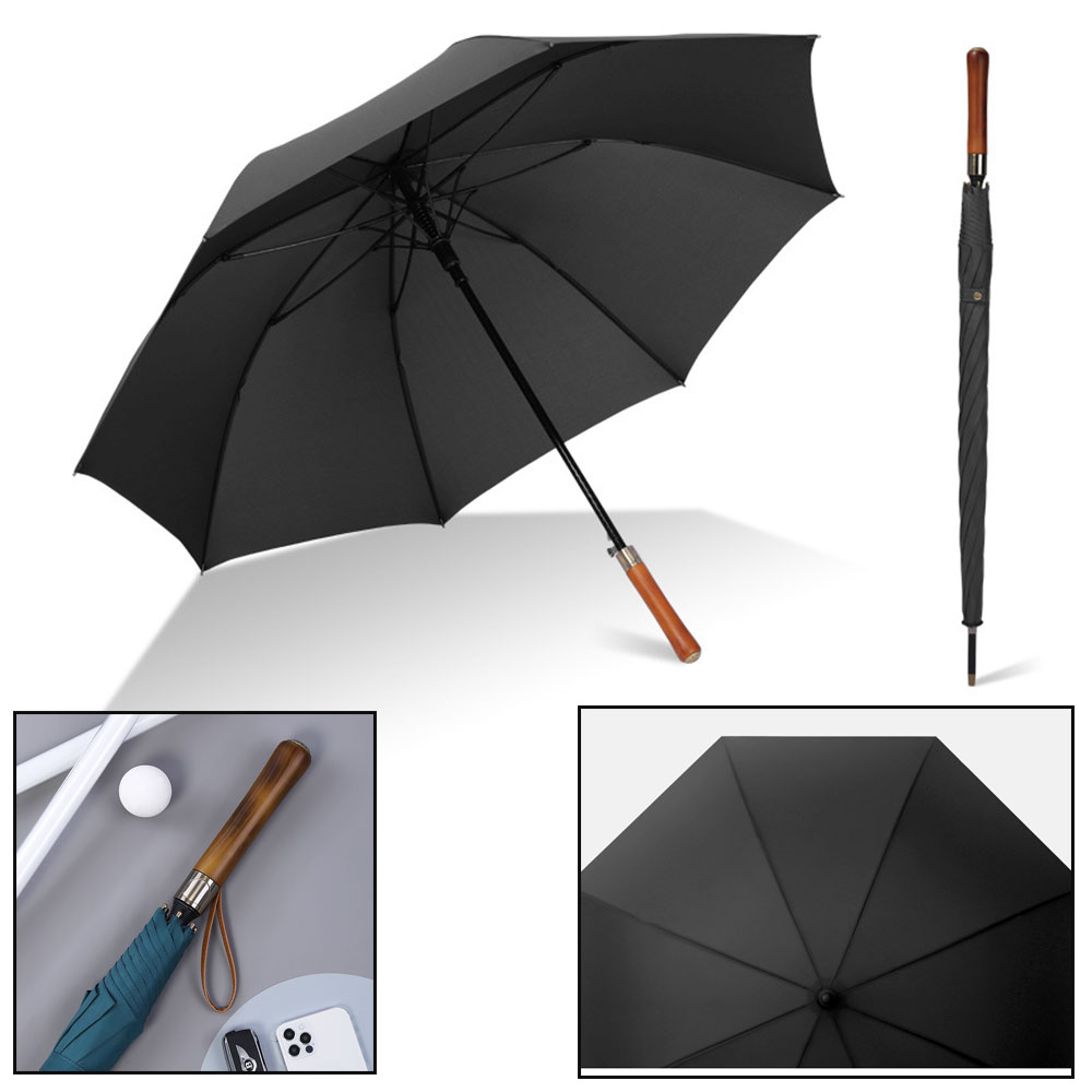 Featured with straight wooden handle, this quality natural wood handle will surely improve your brand's character. Automatic push button open design, comes with 8 panels. 37" close in length and 54" arc. Made from waterproof pongee polyester fabric, constructed with fiberglass shaft and ribs. Free self fabric colored sleeve. Welcome to inquiry us!