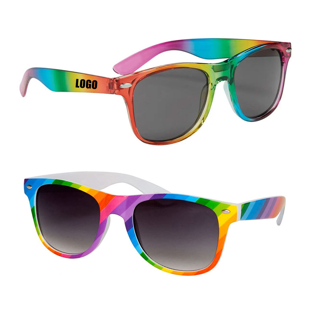 These sunglasses feature durable frames with rainbow-colored design, black lenses and small metal accents on both sides of the frame. These rainbow sunglasses are the perfect giveaway for summer events, weddings and more. UV400 protective lens and polycarbonate frames. One size fits most adult.