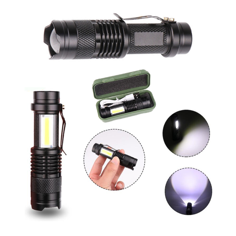 Catch this new generation hot sale mini flashlight now! Small and portable handheld flashlights enough to be fit in/clip on your pocket, handbag, belt. (3 3/4 inch L x 1 inch W). Ultra bright premium LED and COB bulb inside. 3 Modes brightness switched by button, high/sos strobe/side COB worklight. Powered by 1 inserted rechareable battery. Zoomable focus beam design, adjustable focus torch light for long distance observation or large area illumination, stretches to adjust. Water Resistance ( IPX6 ) & Skid-proof design, can be used in rain but not intended for diving. Perfect handheld flashlights for use around house, dog walking, hunting, cycling, hiking, camping, fishing, emergency, vehicle, and other outdoor activities. Your logo can be laser engraved on permanently, inquiry us now!