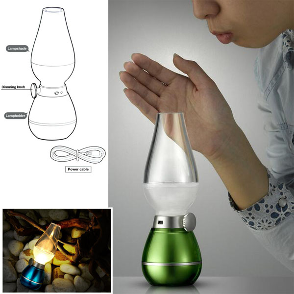 Creative retro kerosene LED lamp, very unique, not only a night lamp, but also an eyecatching decoration lamp for home,hotel,party,etc. With blowing control design, very convenient and special, when you blow to lamp-chimney, LED light will be on, when you blow to lamp-chimney again, LED light will be off. Built-in 400 mA battery, power by USB port, very simple to operate, once charged, last for 8-10 hours. Materials: Aluminum Base + Acrylic Lamp Shade.