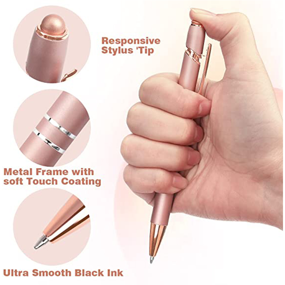 Pen holder is made of high quality metal material, comfortable and durable. One end features an ultra-sensitive fine stylus. The other end is outfitted with a quality ballpoint pen for convenient use (Black ink). The pen comes rose gold color. This kind of bright and beautiful color can bring you more comfortable look and feel.