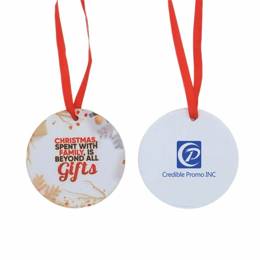 This round ornament is made of ceramic. The lanyard is available in red and gold colors. Full-color printing can be done on both sides. Perfect for holiday gifts. Our prices include printing on both sides.