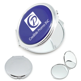 Custom high quality foldable cosmetic mirror. Round shape, double mirrors inside, easy opening. Pocket size: 2 3/8" X 2 3/8". Non-slip bottom design. Chrome plated metal surface. All material safety tested. Your artwork can be epoxy imprinted on the upside of lid. Hot sale on US market !
