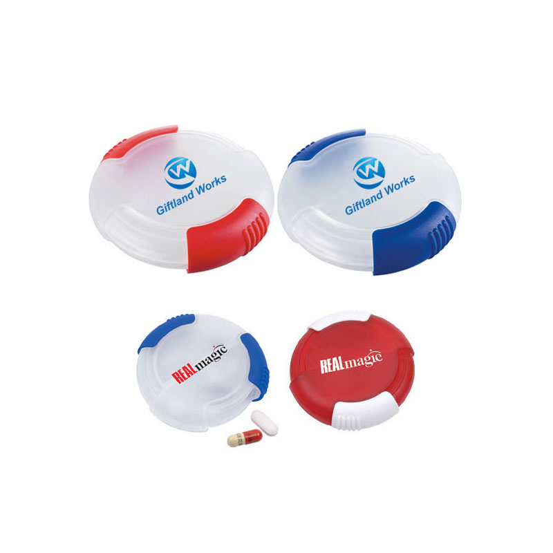 | Feature : | Round shape double slide Pill Box, with 2 Compartments. |