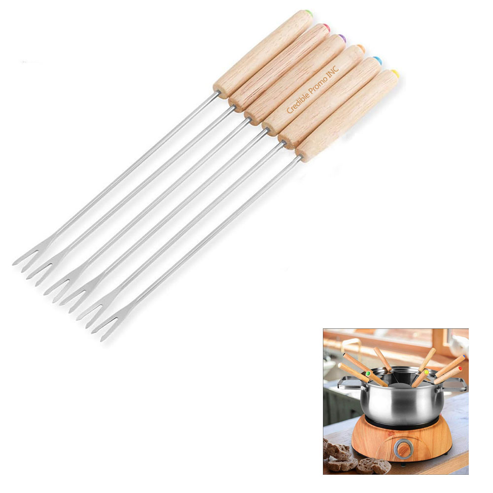 Set of 6 Stainless Steel Fondue Forks Cheese Sticks With Wooden Handle
