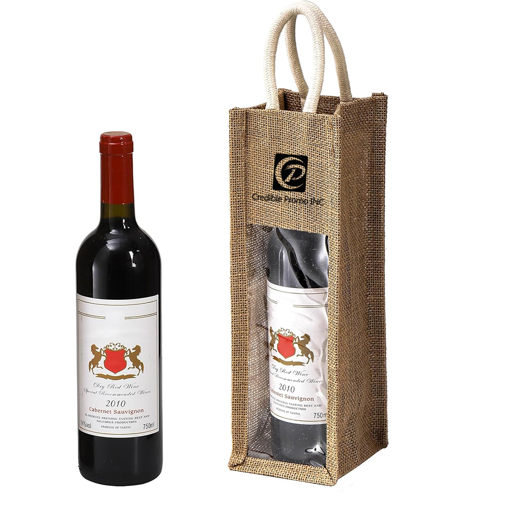 Single Burlap Jute Wine Bottle Bag With Clear Window