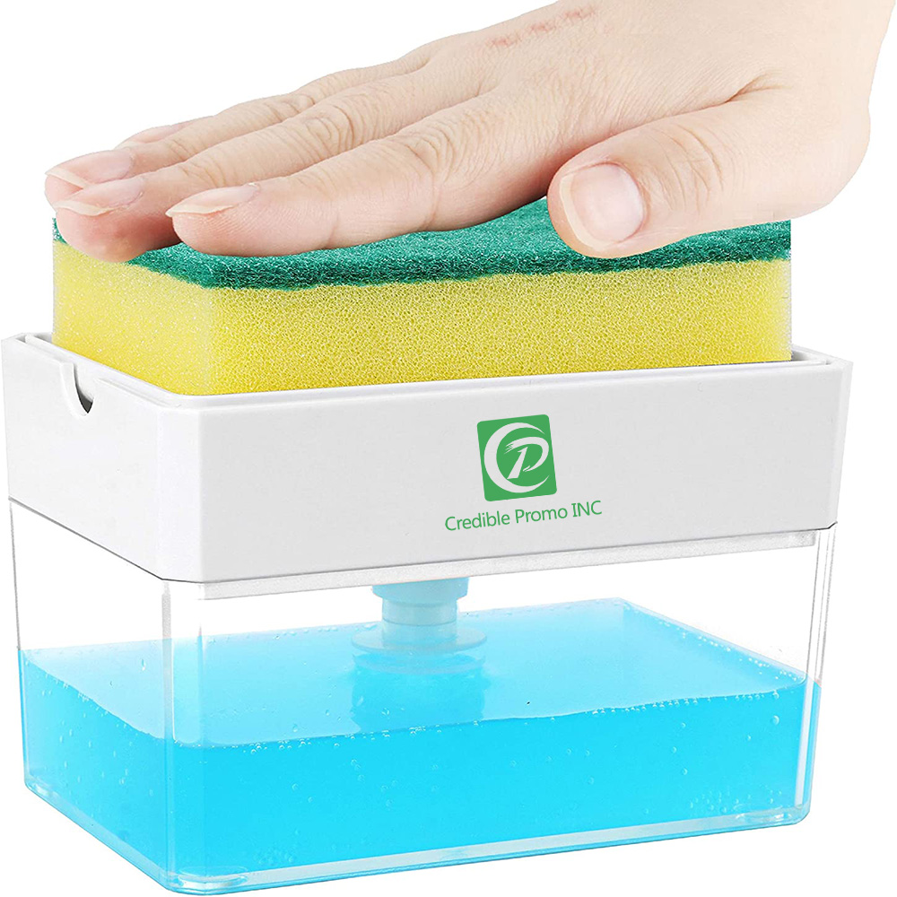 No more messy spills, dripping, or trailing! Kitchen soap dispenser with attached caddy holds sponges, scrubbers, rags, scouring pads in one convenient place while keeping water off kitchen counters. Dispense the perfect amount of soap onto the sponge every time. Can help reduce wasted soap as you can always use a considered amount. Works with all kinds of liquid soaps.