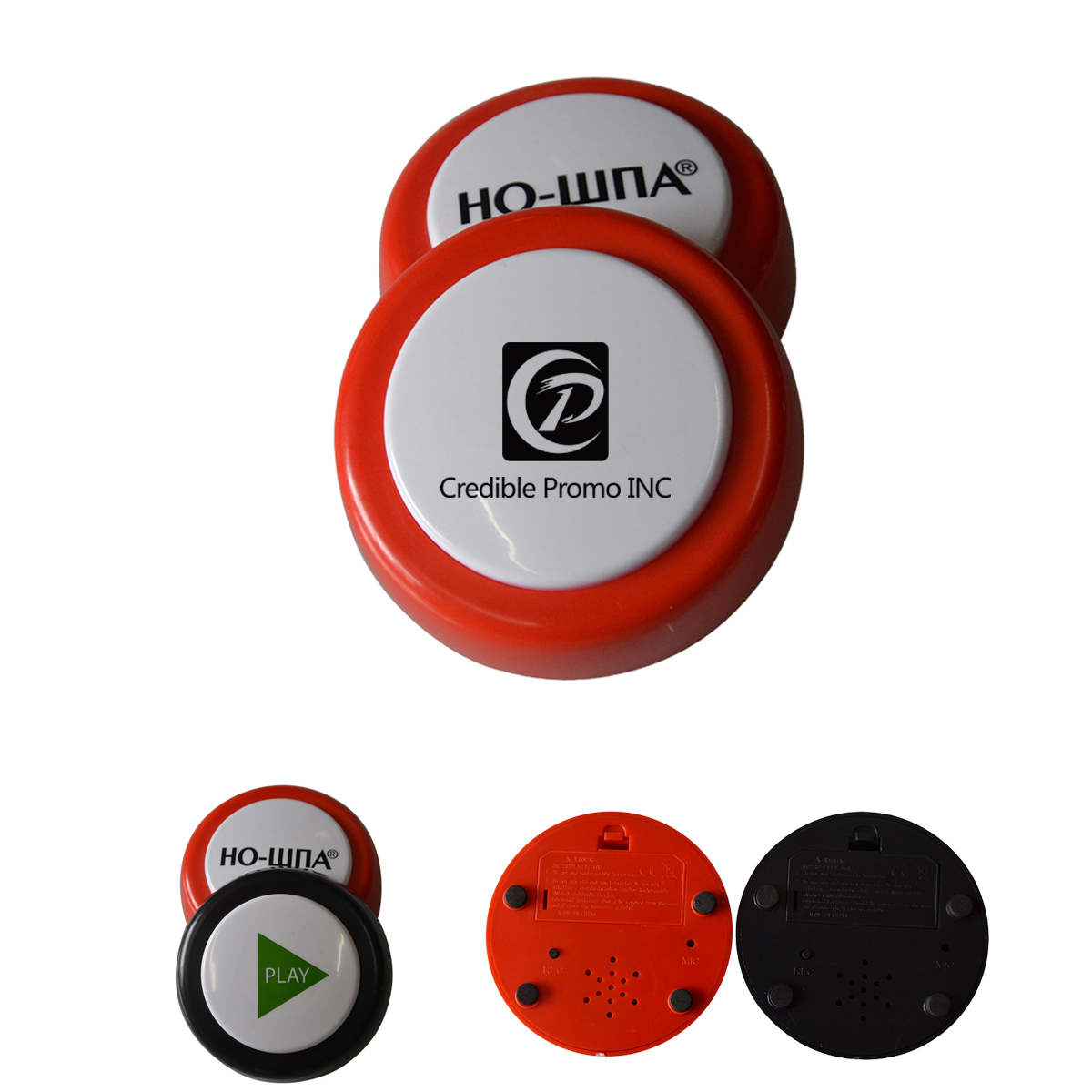 Made of ABS plastic. Features the custom sound: 0-270 seconds(If you send sound file to us with mp3 or wave file format so that we could record sound into the chip of recordable button). With custom logo, we can print your logo on top or side of recordable button. When you press the top of recordable button and it will play your pre-recorded sound. Price NOT include batteries. 90*90*30mm.