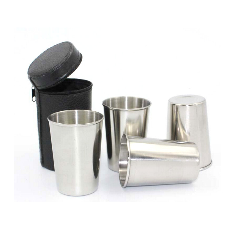 Stainless steel drinking cup set, made from food grade material. Four 6 OZ/180 ML cups packed in one leather zipper pouch. Portable and handy. Suitable for beer, coffee, whisky, wine, vodka, tea and so on. Great partner for outdoor and travel! Your customized logo can be laser engraved or silk imprinted on each cup.