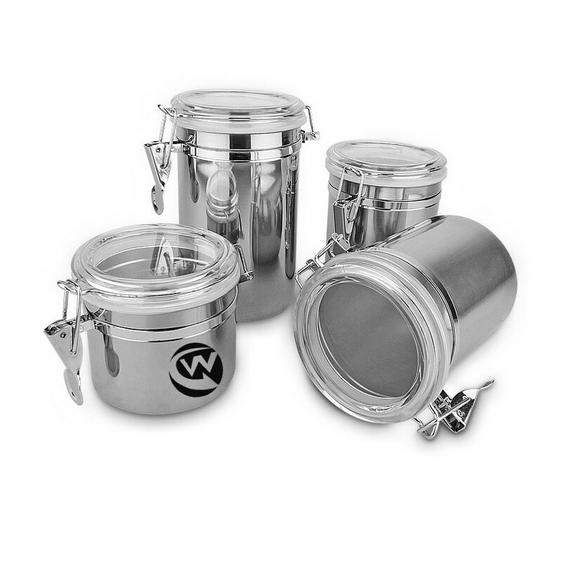 Kitchen airtight canister set, made from stainless steel and acrylic lip. Including 4 canisters (Each diameter is 4 inches): 500ML/17OZ, 800ML/28OZ, 900ML/31OZ, 1200ML/42OZ. Content visible with this clear acrylic lid. Easy press locking clamp design. Airtight, dampproof, fresh-keeping, easy cleaning. Great to save coffee beans, nuts, candy, oatmeal, milk powder, and other food.