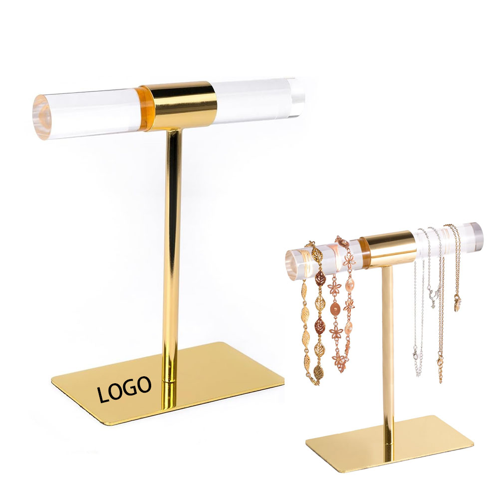 The sophisticated T-shaped design, featuring a metallic base and supporting pillars, ensures an organized presentation of your jewelry collection. Transparent acrylic rods, aligned horizontally, optimize space by effortlessly accommodating necklaces, bracelets, hair accessories, and pendants, allowing each exquisite detail to shine brightly. This elegant arrangement adds a touch of sophistication to your treasured pieces.