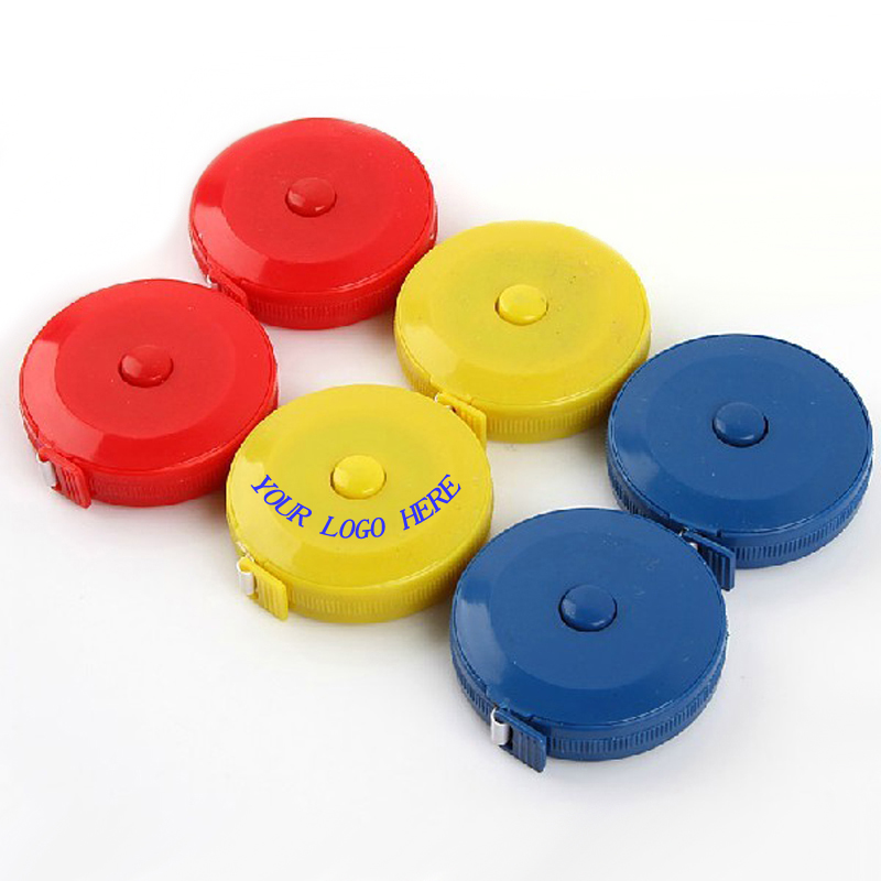 Tape Measure with keychain, Round Shape. Length is 59 inches. One side is inch scale, the other side is centimeter scale. Your LOGO can be imprinted on the shell.