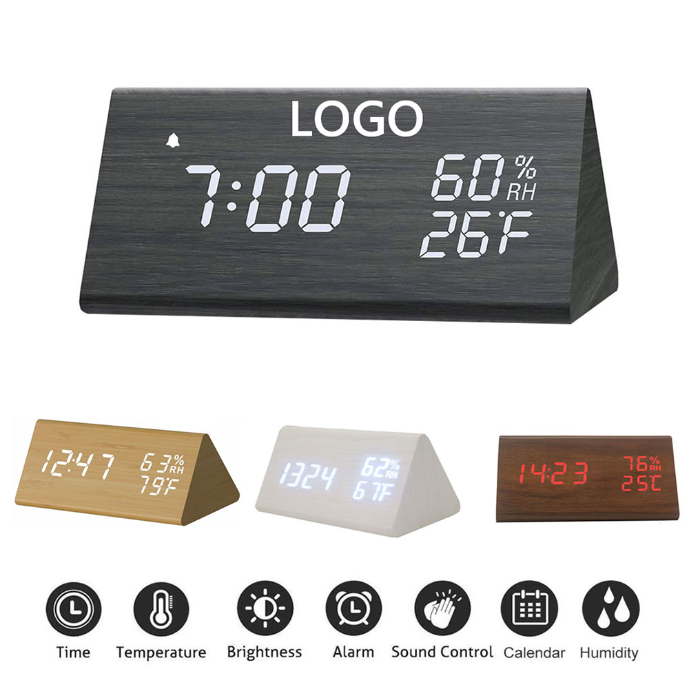 | Feature : | Triangle Wood Grain Digital Alarm Clock Electronic LED Time Display with Humidity and Temperature |