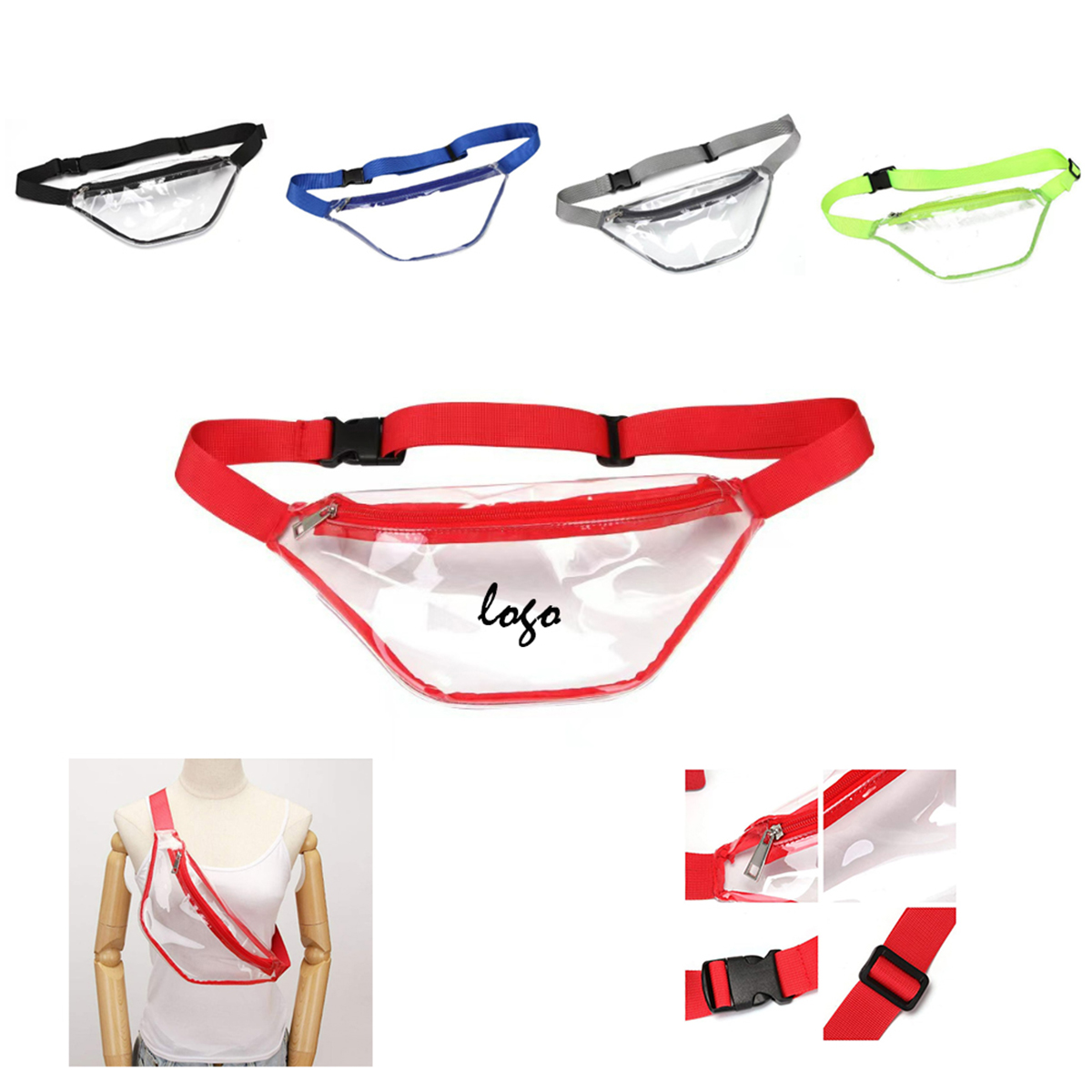 Fanny Pack is made of PVC material, features a main zippered compartment with an open inner pocket. It can be used as waist bag, chest bag, shoulder backpack or handbag. Perfect for stadiums, travel and outdoor activities.