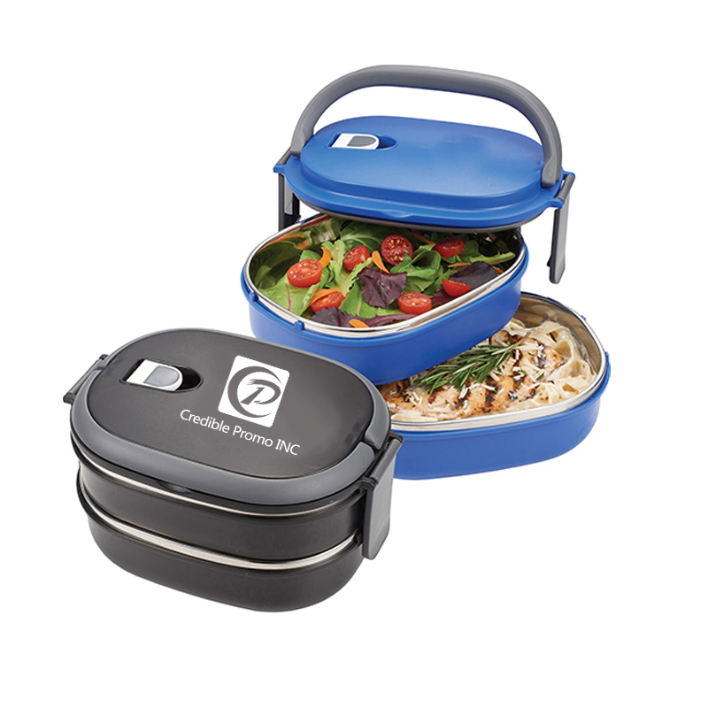 This promotional oval lunch box is a practical appreciation gift. It features two tiers for seperating the food contents. This functional lunch box is available in black and blue colors to choose from. Your logo can be featured on the top for better visibility.