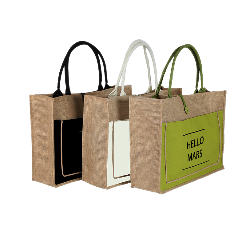 | Feature : | Custom Natural Two Tone Cotton Pocket Jute Burlap Tote Bag With Medium Size W13.7" x H11.8" x D5.5" |