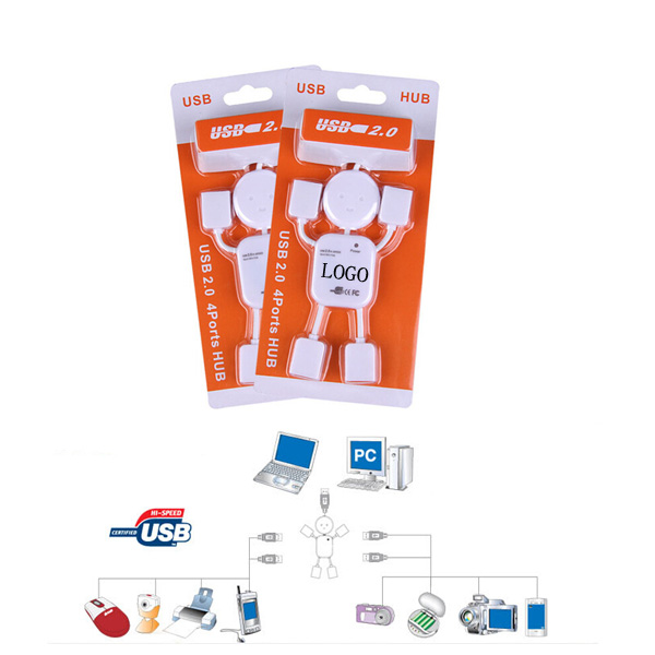 Humanoid shape 4 ports USB hub 2.0. Maximum data transfer rate is 480 Mbps. 500 mA each port is reliable. Fully compatible with USB 2.0/1.0 specification. Support hot plug and play. Individual port over current protection. No driver installation required. Indicator light status. System requirements: Windows 95/98/2000/ME/XP/WIN7/Vista/MAC.You customized LOGO can be imprinted on.