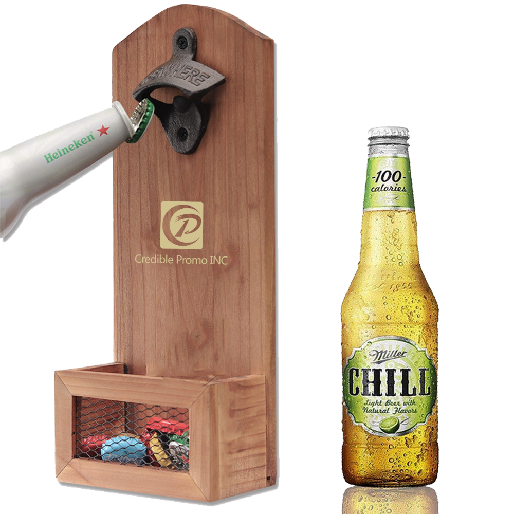 Wall Mounted Wooden Bottle Opener With Cap Catcher