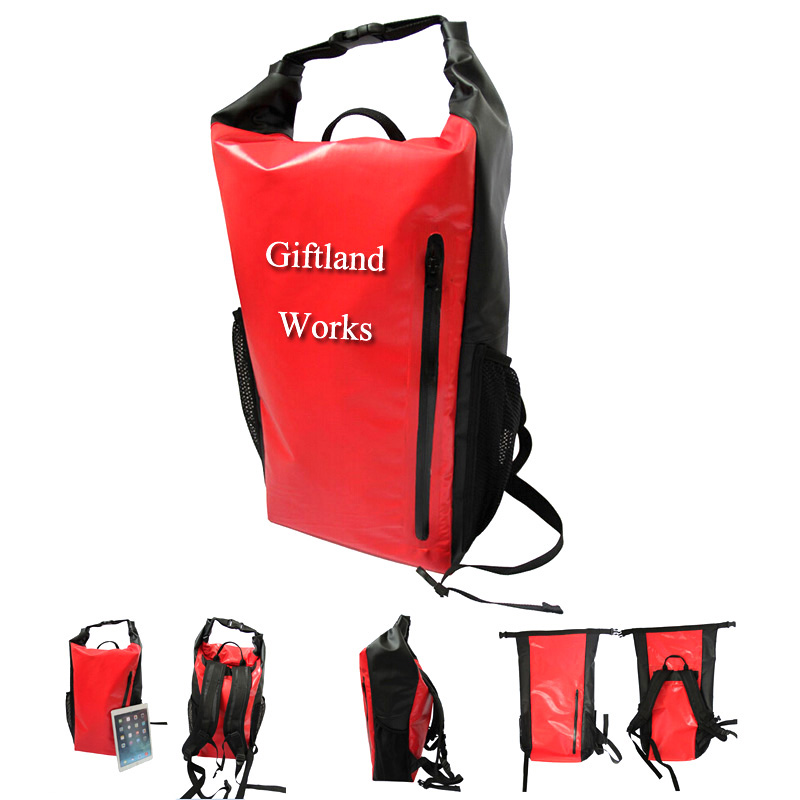 Fashionable high quality waterproof backpack. Well protect your digital items and other valuable items from water. Made from 500D PVC and Mesh blended material. With adjustable double shoulder straps and handle design, a zipper pocket in the front and two mesh pockets on sides. Volume is 30 L. Your best partner when go camping, beach, swimming, fishing or other outdoor activities. Your company LOGO can be imprinted on the large area.