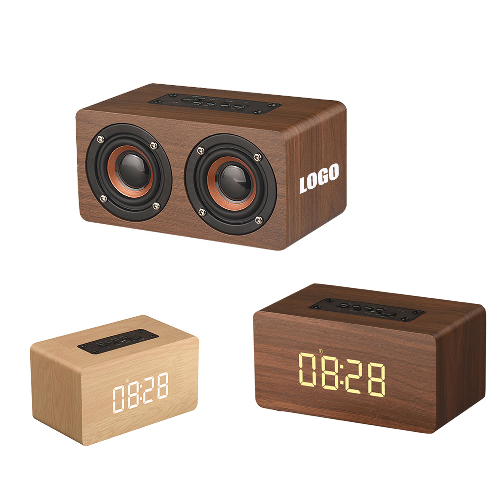 Speaker works up to 32 feet from device, compatible with all bluetooth devices like Phone, tablets, laptops, and computers. Easy-to-use control panel includes Power switch, Volume controls, UX cable input port, and microphone port. It come with a micro-USB charging cable and a gift box. The wood-look finish makes this speaker a classic additional to any home or office, designed to fit on desks, book shelves, and end tables. It support to imprint logo in the margins.