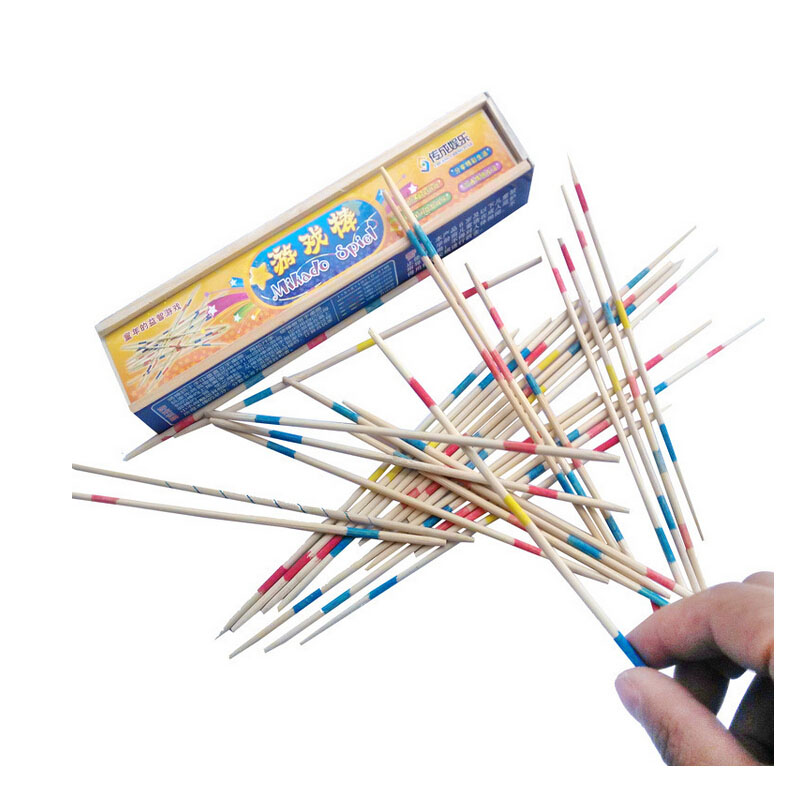 Traditional pick up sticks game, including 31 sticks. Hold all the sticks in your hand, loosen your hand, let the sticks scattered. Pick up them one by one slowly, but do not let others move. If moves, then change to other people, until pick up all of the sticks.